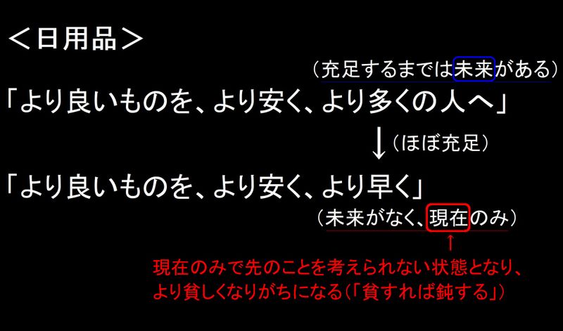 これは日用品の概念「より良いものを、より安く、より多くの人へ」というものが時代及びテクノロジーの進歩と日用品の充足によって「より良いものを、より安く、より早く」に変わったことから引き起こされています。