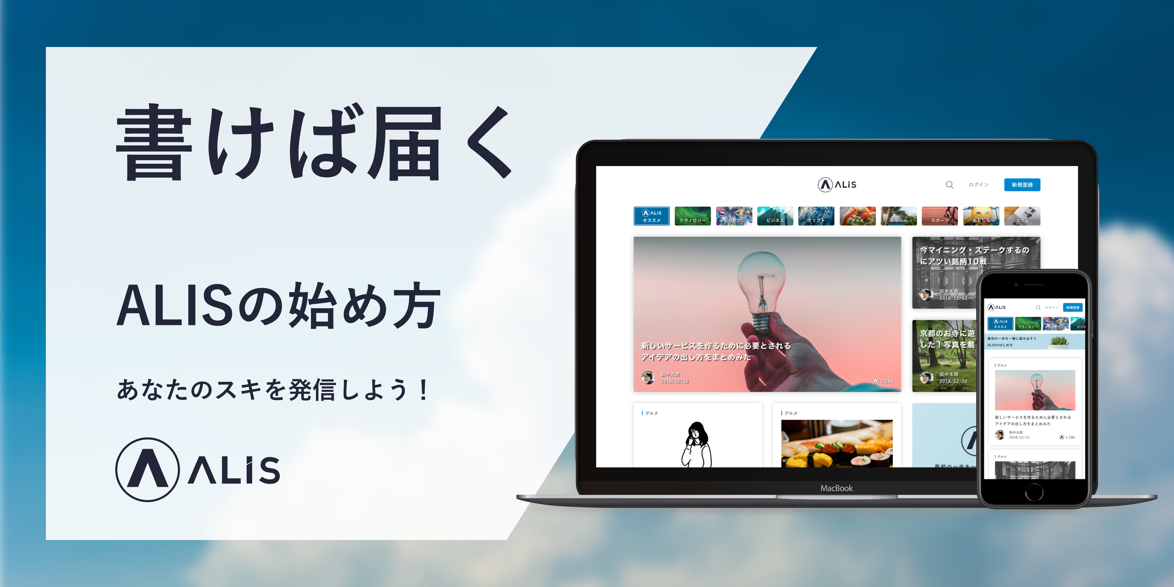 ALISは「好きなこと・伝えたいこと」を持っている人にとって最適な情報発信の場所です。TwitterやInstagramのフォロワー数も、GoogleのSEOで影響力を発揮するために必要な記事数もここでは関係ありません。あなたがALISで全力で書いた記事は広く発信され、必ずどこかで誰かの心を動かすことができるはずです。
