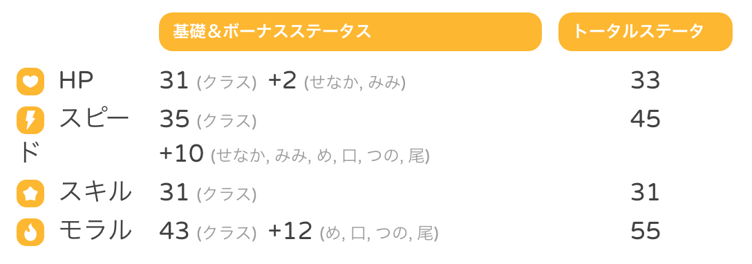アクシーのトータルステータスは基礎ステータス(アクシーのクラスによる)とボディパーツのボーナスステータスから導き出されます。