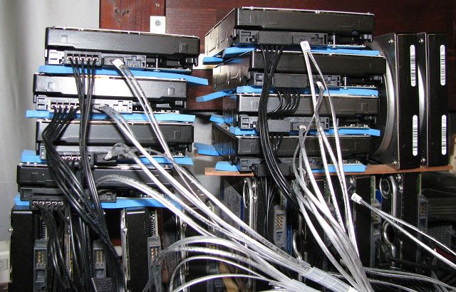 中古サーバーから抜き取ったMIDプレーンを魔改造(HDDを垂直固定)してHDDを組み込むところ。このあと、厨二病的な自作ラックに組み込まれていく
