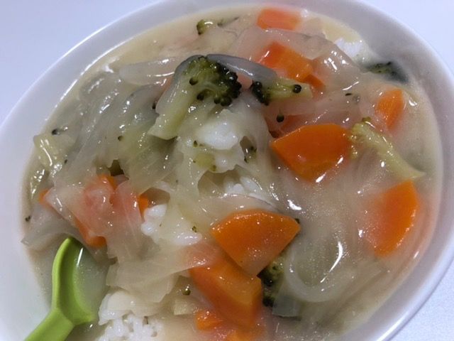濃いシチューとのことでご飯のうえにカレーのようにかけてみました(´◡`๑)