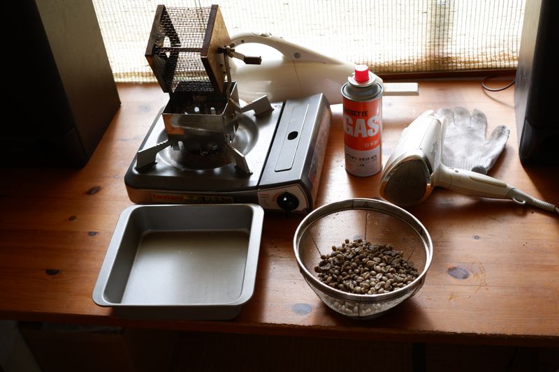 今回、焙煎器にはアウベルクラフト(https://www.facebook.com/auvelcraft)の手回し焙煎器を使います。ただ、焙煎器にもいろいろあります。モーターで自動で回転するタイプや、ザルを2枚組み合わせたようなものや、焙烙のようなもの、などなど・・・。コーヒー豆には薄皮(チャフ)がついているのですが、薄皮が排出されずに閉じ込められたまま焙煎すると、豆が薄皮の煙で燻製されるような状態になって風味が悪くなってしまいます。なので、薄皮が出て行くように、網目が大き目のものを選ぶことをオススメします。