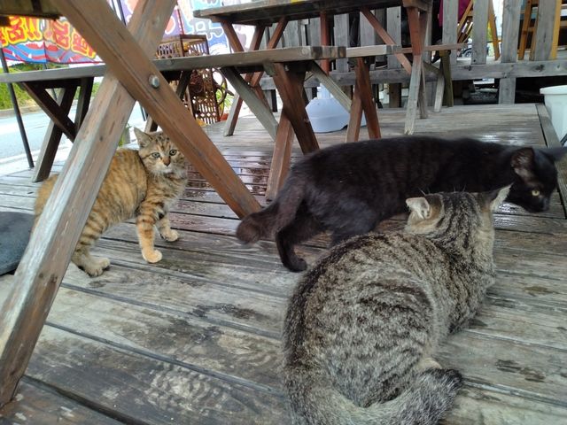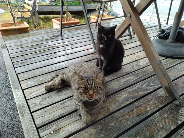 テラス席に猫三匹が。ここで買ってる猫なのか、近所から遊びに来たのかは不明。