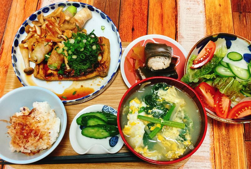 ・焼き厚揚げと白ネギの豚バラ巻き(木の子とにんにく醤油ソース)