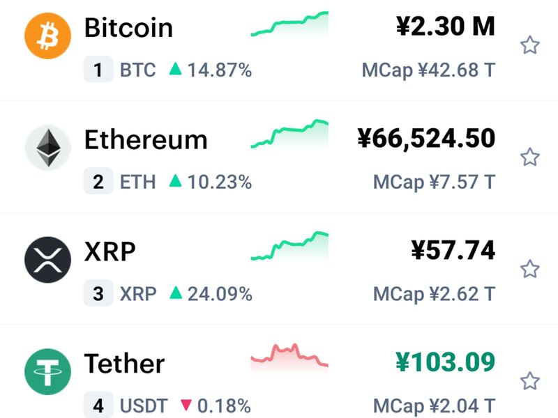 XRP(リップル)保有者を対象としたSparkトークン(FLR)目当てで少し購入しました。その後、Sparkトークン(FLR)の「権利落ち」のタイミングでXRP/JPYが約10円幅急落。ありゃりゃりゃりゃ・・・まー、そうなるわなあとガックリきていましたが、このBTCムーンのおかげで買値まで戻しました^^