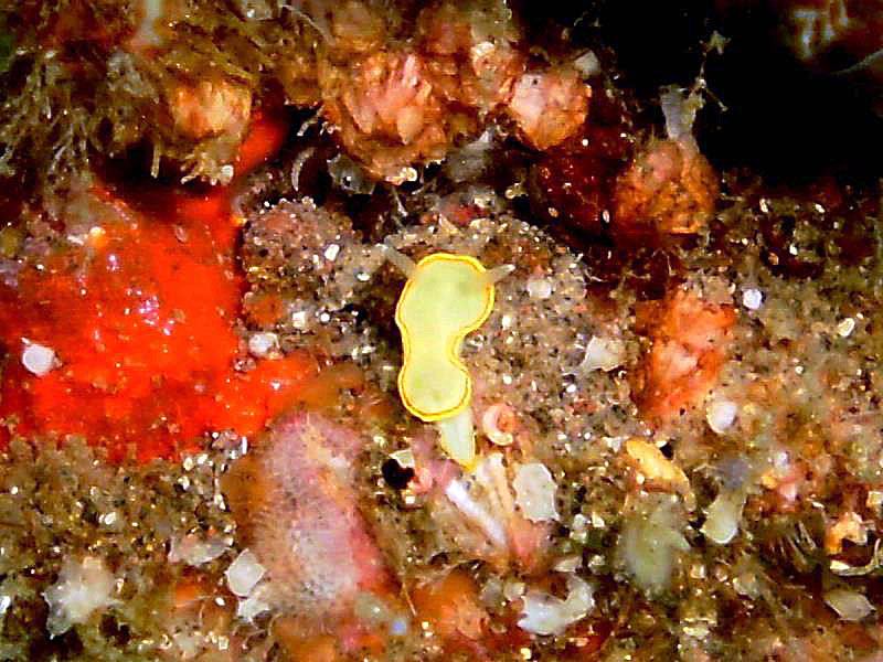 ダイビングエリアでは良く見られるウミウシですが、磯観察ではあまり見かけません。三浦半島の磯では、かつて一度だけ出会いました。黄色と白色のバージョンがあります。大きさは10mm程度と小さいです。国内では房総半島~沖縄で観察されています。