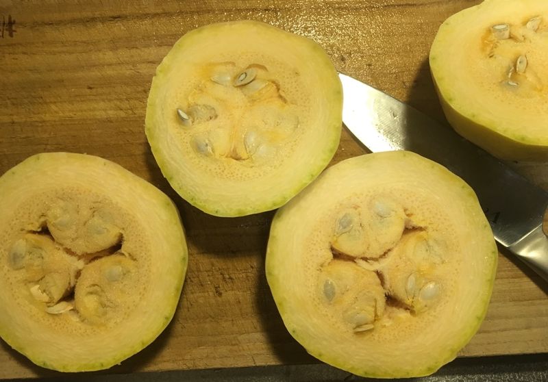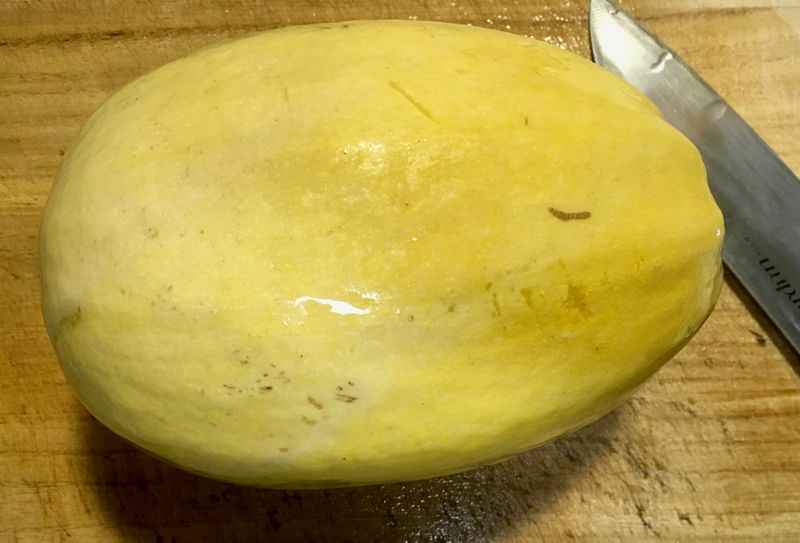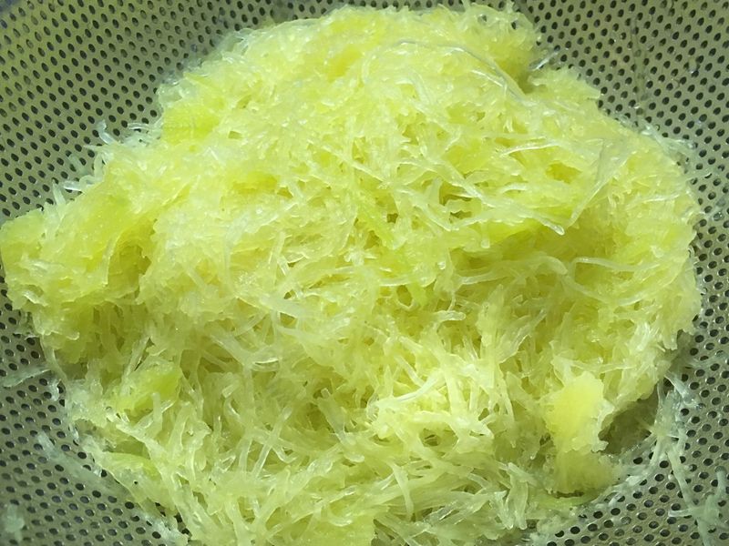 英語ではspaghetti squashともいうそうです。茹でて果肉をほぐすと麺みたいになるので、そんな感じの名前が付いてるんですね。