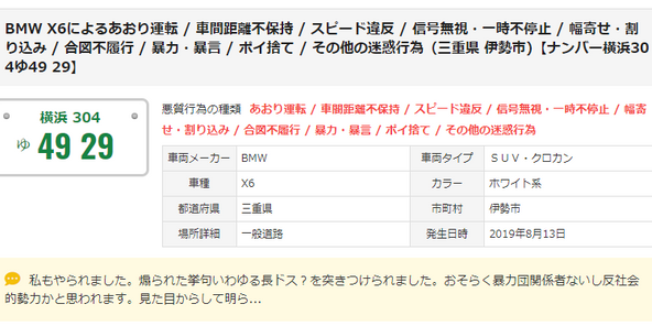 【ナンバー 横浜 304 ゆ 4828 ⇒ 4929】 迷惑行為一覧 あおり運転、当て逃げ、殺人未遂、暴行、脅迫