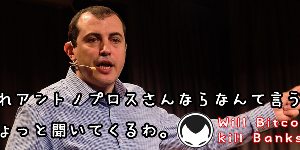 それアントノプロスさんならなんて言うかちょっと聞いてくるわ。“ビットコインは銀行を破壊するか?”