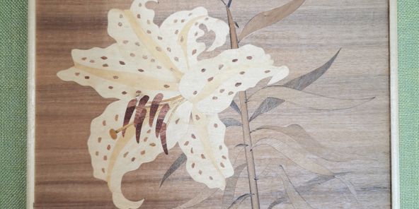 12.古物たちのお勉強~「箱根・木象嵌(もくぞうがん)細工・久右々門・木画 百合」