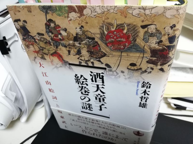・香取本『大江山絵詞』の絵巻のなかの、酒天童子(酒呑童子)の首が、輿に載せられて運ばれる場面の絵図, 『酒天童子絵巻の謎』の本の表表紙, この写真は筆者が撮影したものです.