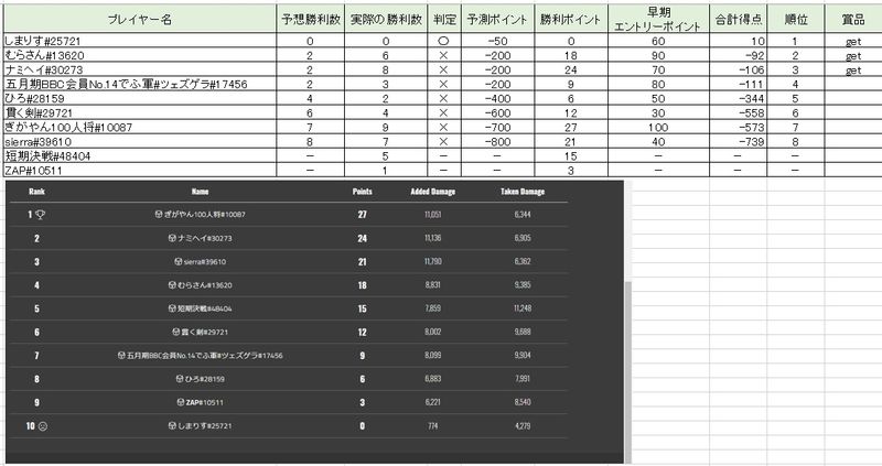 ・0勝予想は当たっても外れても-50点。なので勝ちに行った方が得点が伸びるが、しまりすさんのヒーローが「素手」だったのと僕のMCH3兄弟が出ているおかげで実質的に他の人が「2勝以上確定」になってしまい、予想よりも多く勝利することになった気が。